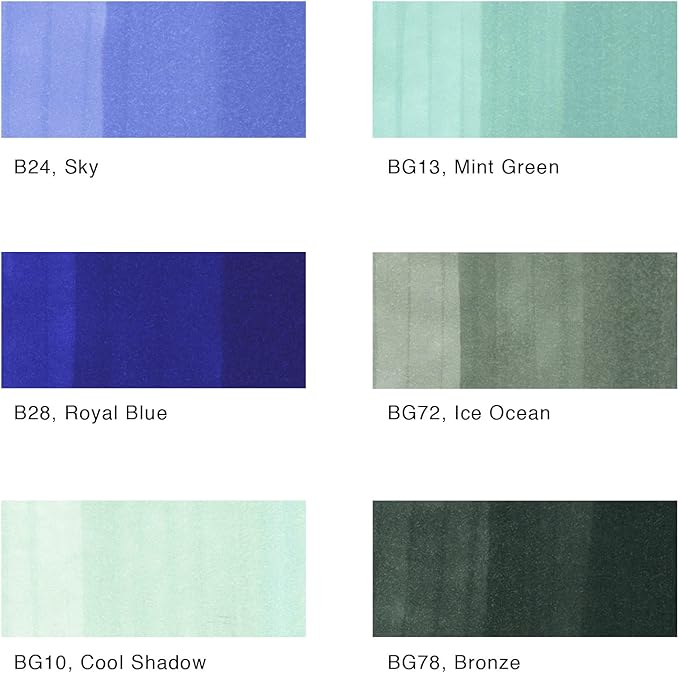 • This 6 piece Sea & Sky set includes a combination of blue and blue-green colors, B24, B28, BG10, BG13, BG72, and BG78. Perfect for creating oceanic scenes and water illustrations.