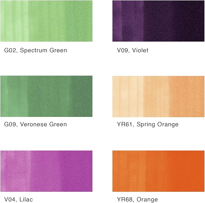 • This 6 piece set includes mid-tone and dark values of the secondary colors: G02, G09, V04, V09, YR61, and YR68. The perfect companion to the bold primaries set.