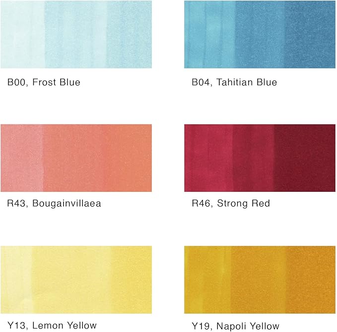 • This 6 piece set focuses on lighter-tone primary colors: R43, R46, Y13, Y19, B00, and B04. Great companion to the Bold Primaries set and is a must for your Copic marker collection.