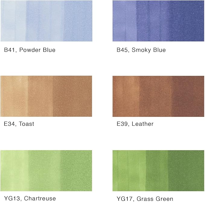 • This 6 piece set includes curated colors of the earth, blues, browns, and yellow-greens: B41, B45, E34, E39, YG13 and YG17. A great companion to the Sea & Sky set.
