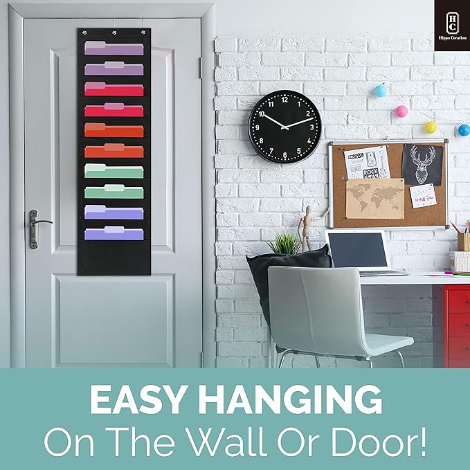 Hippo Creation Heavy Duty Storage Pocket Chart for Classroom, 10 Pocket Storage Organizer with 2 Over-Door Hangers, Hanging Wall Organizer for File Folders, School Mailbox, Home Office Papers - Black