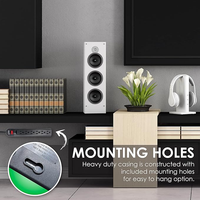 • 25 Foot, 6 Outlet surge protector power strip with lighted On/Off switch. Rated for 15 AMP / 120V / 60 Hz / 1875 Watts / 1ns response time. 14/3 Gauge Wire. Two keyhole style mounting holes in the back. ETL Listed, UL Standard 1363.