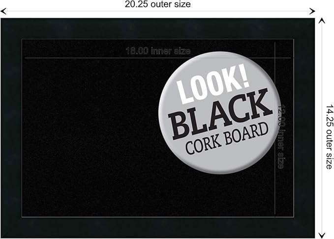 • DIMENSIONS: The overall size of this framed corkboard measures 20 in. x 14 in., including the frame. Its functional cork board area measures 18 in. x 12 in.