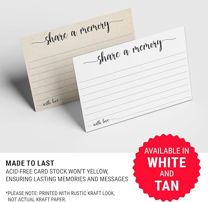 321Done Share a Memory Card, Made in USA - 4x6 Kraft Tan, for Celebration of Life, Birthday, Anniversary, Memorial, Funeral, Graduation, Bridal Shower Game - Set of 50