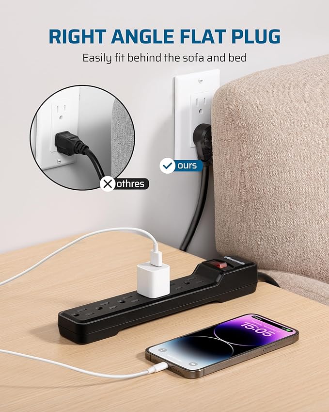 • 【 Low Profile Flat Wall Plug 】Right angle flat plug allows furniture to be pushed against the wall; the slim design is ideal for tight spaces behind TV bracket, sofa, nightstand, and headboard
