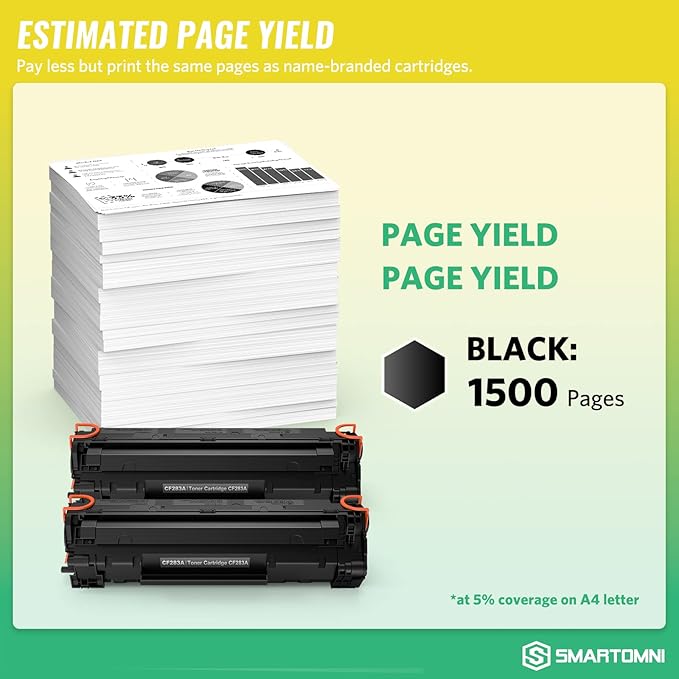 • Estimated Page Yield: Each black toner cartridge can print 1500 pages at 5% coverage of letter/A4 as usual