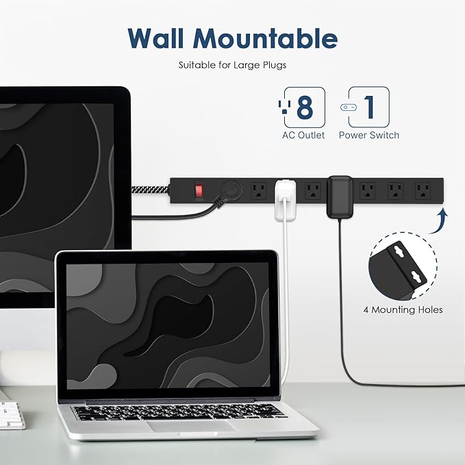 - 【8 in 1 Power Strip】This mountable power strip features 8 outlets and 1 switch, providing you with multiple options to connect your devices. With a 6 feet 14AWG braided cord, it ensures durability and easy reach to power sources. Rated at 1200J, 1875W, 15A, 125V, 60Hz, and with SGS certification, it guarantees safe and reliable charging.