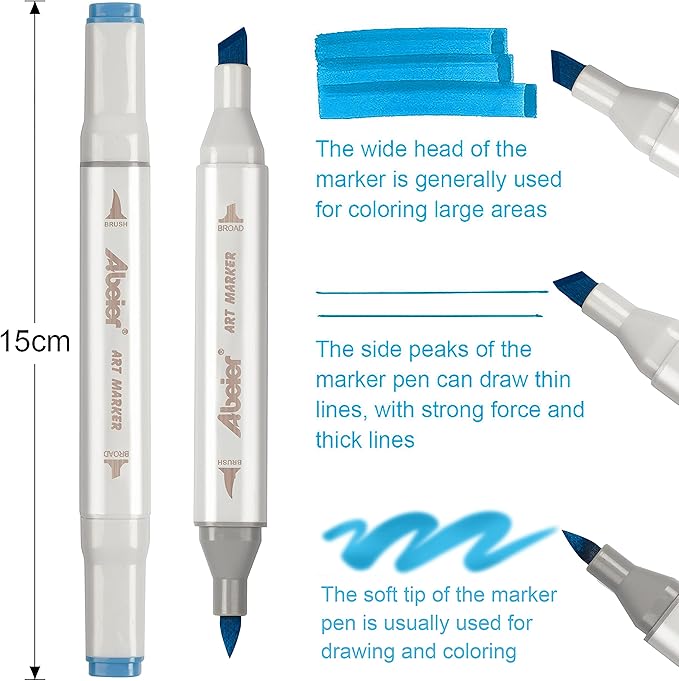 • Double Tip Brush & Chisel Alcohol Art Markers: Each Alcohol based Brush marker has a Dual tip marker design, choose the brush tip for sweeping, details Outline, choose chisel tip to quickly color a large area. Whether it is smearing on a large area or portraying fine lines, it can do well.