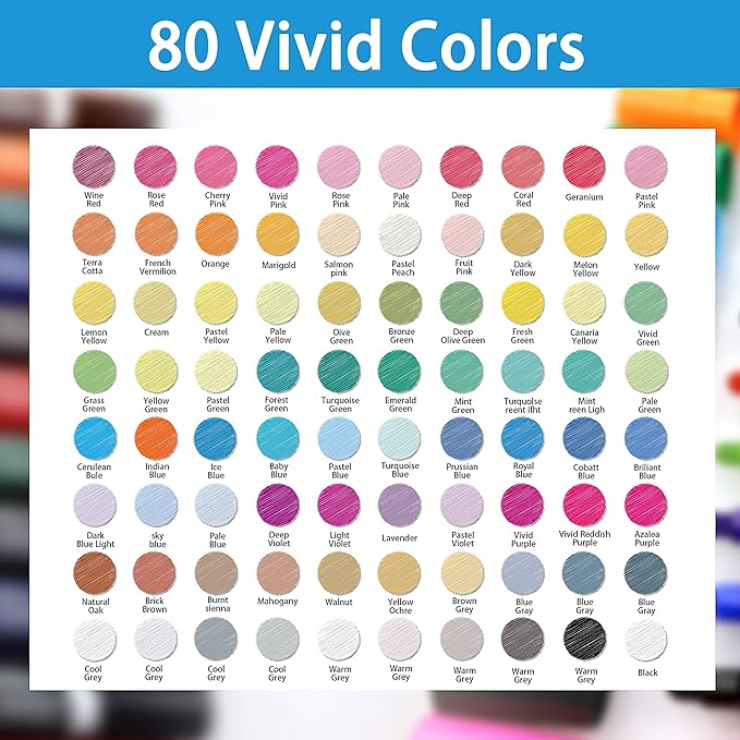 • 80 Vibrant Colors + 1 Free Colorless Blender: Brush tip markers for adult coloring books , anime pictures, fashion design, coloring, drawing, writing, sketching, illustrating, shading, designing, rendering, manga, comics, cartooning, etc. Great as Markers for Adult Coloring, art markers, sketching markers, drawing markers, permanent markers, alcohol based markers, alcohol markers brush tip, alcohol brush markers.