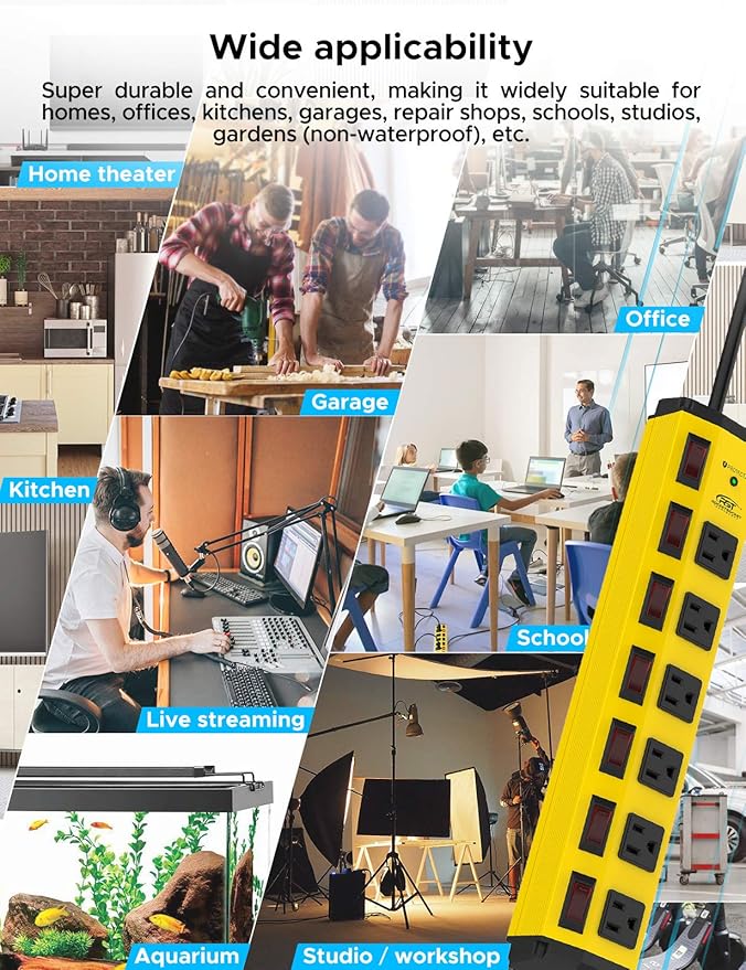 - [Individual Switches & Wide Spaced] This heavy duty power strip is equipped with 6 individual switches and one master switch, offering you the freedom to control each device separately, which is both energy-saving and cost-effective. The outlets feature a generous 1.77-inch wide spacing, designed to accommodate plugs of all sizes, preventing blockage issues. You can effortlessly use multiple bulky adaptor plugs at the same time without the need to frequently plug or unplug, greatly enhancing convenience and operational efficiency.