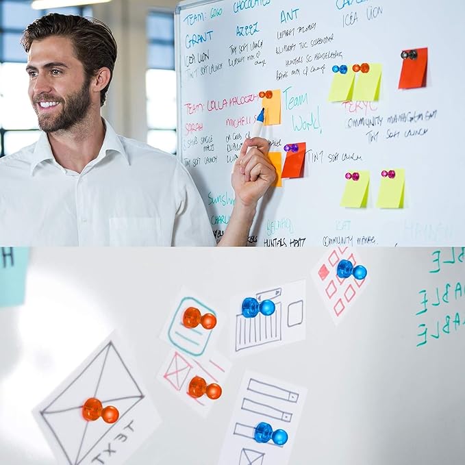 • SMALL STRONG MAGNETS: Each powerful magnet holds up to 11 sheets of paper on any metallic surface. No more sliding papers with cheap magnets. These push pin magnets are tiny too so they won't cover up exact things you want to display.