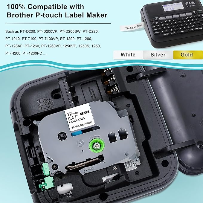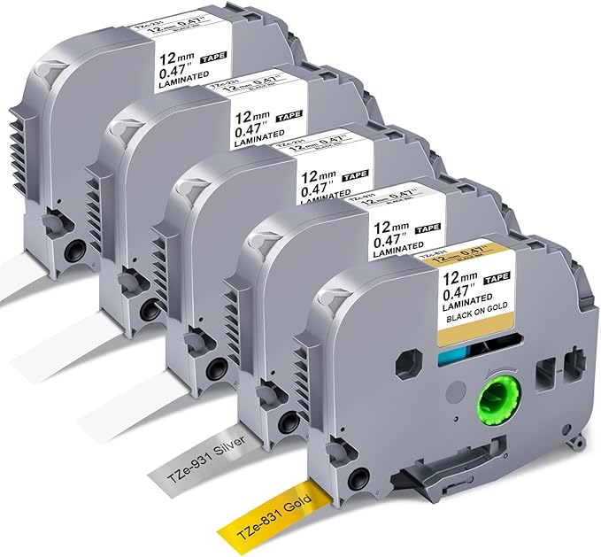 5-Pack Label Maker Tape 12mm 0.47 Inch Laminated White/Gold/Silver Muti-Color Replace for Brother TZe TZ Tape TZe-231 TZe-831 TZe-931 Compatible with Brother P-Touch PT- D210 D220 H110 D400AD