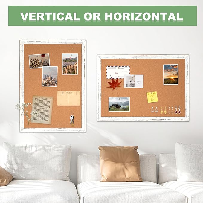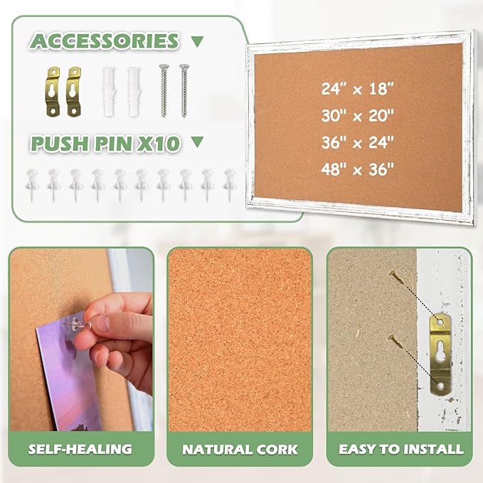 • Thick Solid Frame: Featured in a vintage-style white design, our bulletin board adds a rustic look to your room or office. Not only a bulletin board but also a perfect decoration. The thick and sturdy frame ensures a long-time use of this corkboard