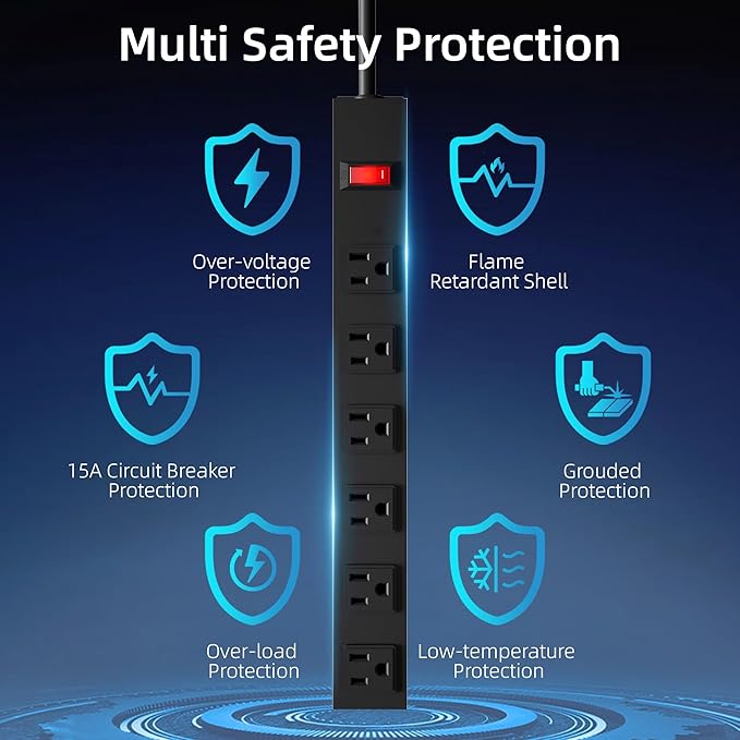• OVERLOAD PROTECTION:A power switch with lighting has a built-in high quality 15A circuit breaker for overload protection. When the operating current exceeds the rated current, this power strip automatically cuts off the power supply from spikes, fires or other unsafe conditions.