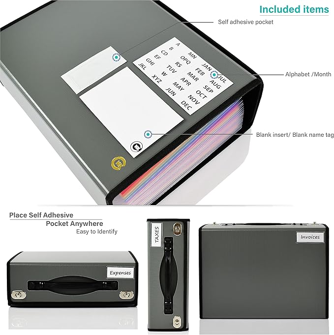 • The Self Adhesive Pockets is included to easily mark and categorize multiple organizers along with Alphabet, Month, Black Tags for your needs! The Month and Alphabet Printed Tags are big and bold to easily see and efficiently designed for easy insertion and removal