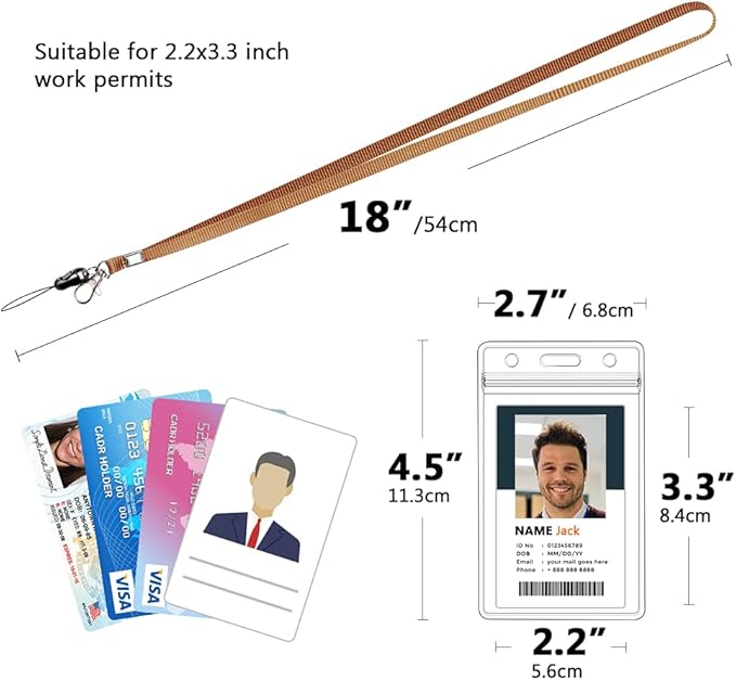 • [PACKAGES]: 6 pack durable neck lanyards-17.8"(45cm) length and 6 pack heavy duty vertical ID badge holders- 3.74" x 2.4" (9.4cm x 6.1cm) demensions fit with 3.54" x 2.24"(8.9cm x 5.69cm) card size.