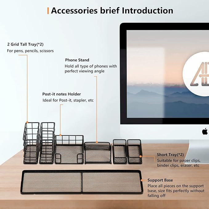 - 【All in One Desk Organizer Set】: 7 in 1 desk organizations ( include: 2 pen holder, 2 binder clips trays, 1 phone stand, 1 post-it notes holder and 1support base), this organizer allows with hundreds of combinations to fit your office desk, bathroom vanity or any other place. It’s a great gift for those who well organized