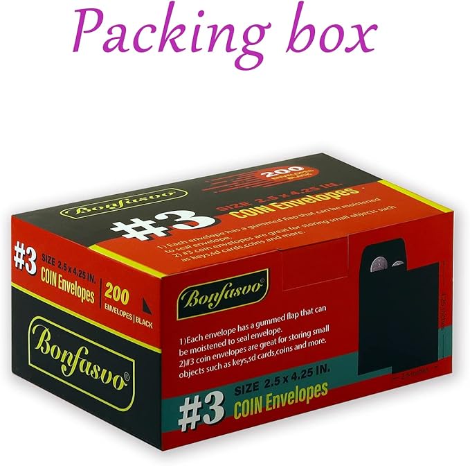 • 【Package Includes】- It contains 200 pack self-adhesive #3 Black coin envelopes, each size is 2.5''x 4.25''.