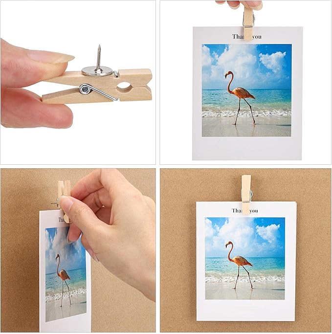 • Wooden clips combine the advantages of clips and pins to enable damage-free display of photos, pictures and notes on a corkboard or bulletin board. And you don't have to remove and insert them from the corkboard as often