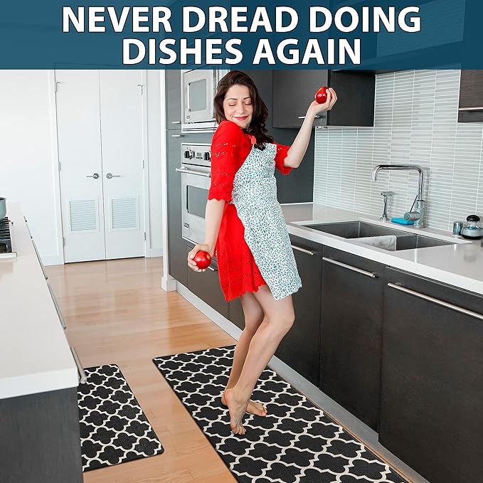 - Water Resistant & Anti Slip - Don't worry about spilling water when doing dishes with our Kitchen Mat! Our non-slip Kitchen Mats are designed to be water resistant and to stay in one place. You won't slip around with the rubber and padded materials on the bottom of the mat!