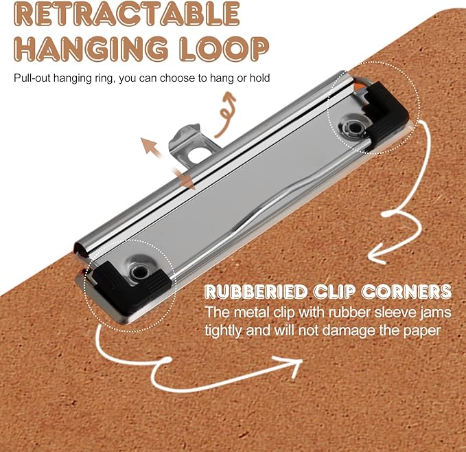 • RETRACTABLE HANGING LOOP: The clipboards have a built-in hanging hole, which can help you place your documents randomly. And it can be stowed away when not needed