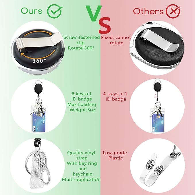 • 360 Degrees Swivel: The retractable badge reel is made of premium plastic and steel, sturdy and light-weight. It is easy to clip on to a belt, backpack, pocket or anywhere you like, with 360 rotating carabiner clip. You can attach your keys, student cards, or ID cards to the key holder easily and conveniently. Great for nurses, doctors, maintenance, office staff, business people, teachers, students, factory workers, drivers, etc