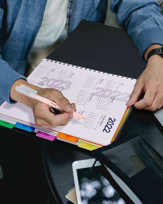 • 5 SUBJECT NOTEBOOK: Thick PP hardcover for durable & water-resistant , 100 sheets (200 Pages). Included Tabs label for marking your cover, 11'' removable ruler, calendar, velcro pocket for journaling writing work office school supplies