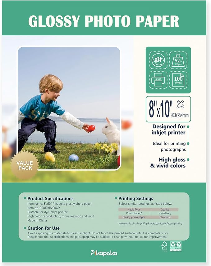 • Pikapoka glossy photo paper 52lb(200gm), size: 8x10 in, 100 Pack