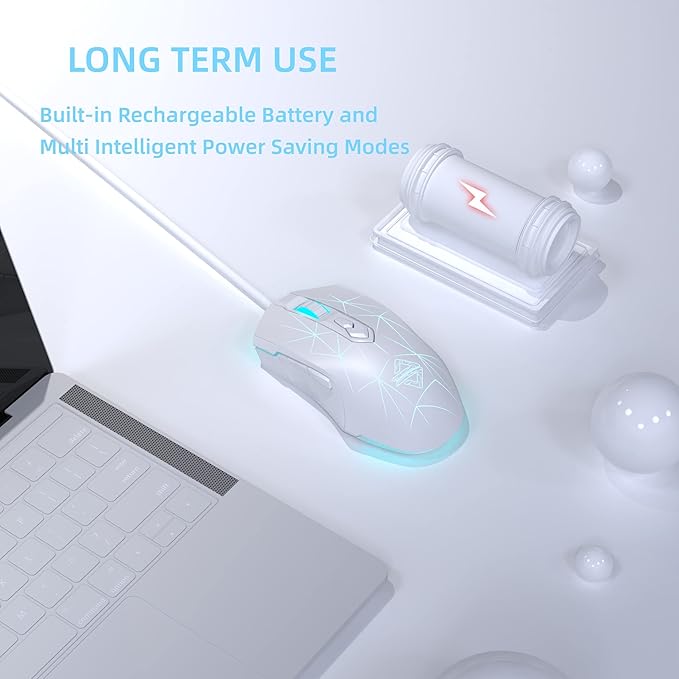 - 【LONG TERM USE】Two intelligent power-saving modes can enter different power-saving states and extend the service time. In wireless and Bluetooth modes, the light at the end of the mouse turns off when the mouse is moved and recovers when it is still. Charging while using in wired mode. Multi-pronged, to ensure that the mouse can be used for a long time.