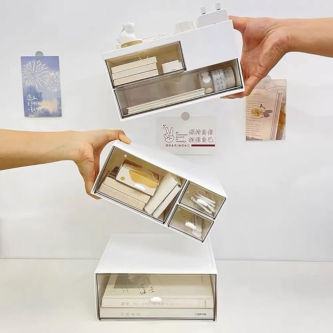 • Stylish white plastic desk organizer with 2 drawers and 4 compartments keeps office supplies organized