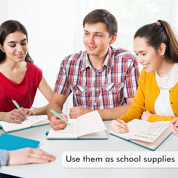 - Feela 5 Pack Classic Ruled Notebooks contains 5 teal ruled sturdy cover notebooks and 5 Black Retractable Pens. Each of the notebooks measures 8.3” x 5.1”, which is perfect to carry and easily held by young girls and boys. These black cute pens are customized to be placed in the pen holder, which is pretty convenient.