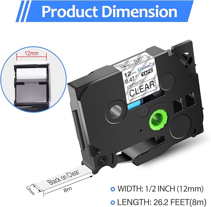 • Color: Black Text on Clear Background, Length: 8m(26.2 feet), Width:12mm (1/2 inch or 0.47'')