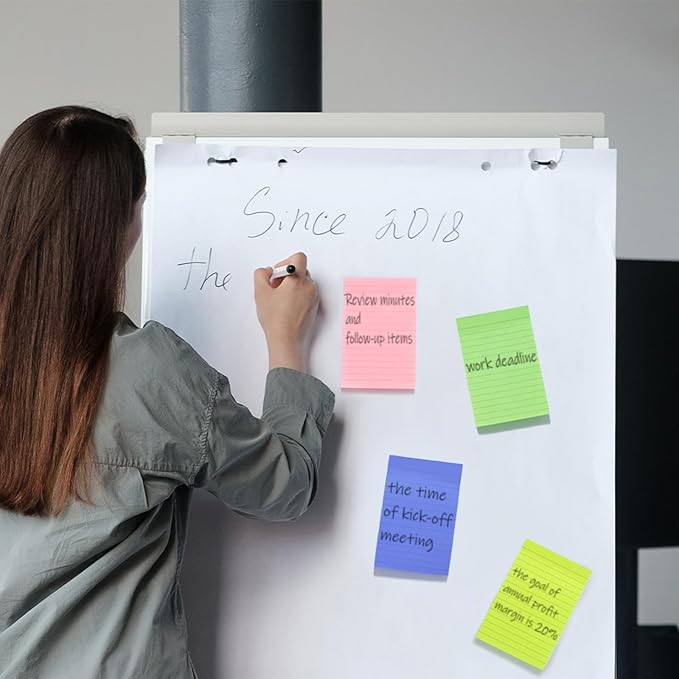 • Package: Comes with 24 packs 4" x 6" lined sticky notes,8 bright assorted color, each color for 3 packs, 50 sheets/pad. 1200 sheets in total. Enough quantity for daily use.