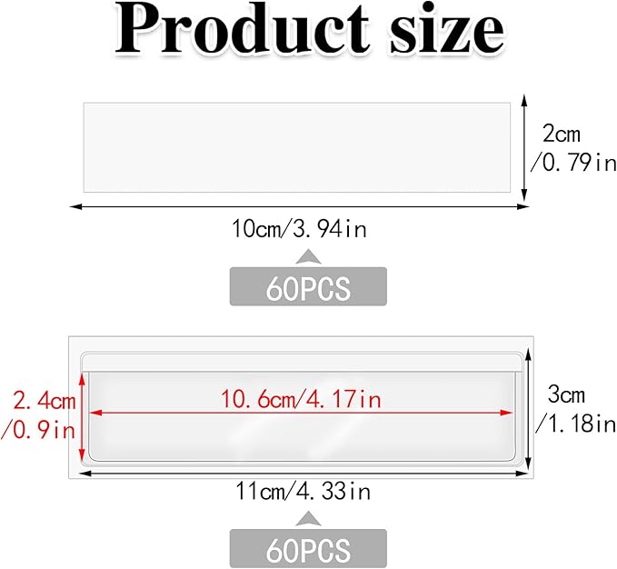 • 【Package】Package contains 60 pack 1.2" x 4.3" clear label pockets and 60 pieces blank 0.8" x 3.9" labels that can be used together, enough quantity to meet your needs.