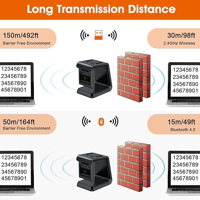 - 2.4G Wireless & Wired :Wired barcode scanner can directly place on the desk, no need to hold the scanner, release your hands, improving your efficiency. If you need to work on the move, 2.4G Wireless barcode scanner can follow you around and get the job done. Barrier-free environment 100Feet ,Barrier environments 50Feet .