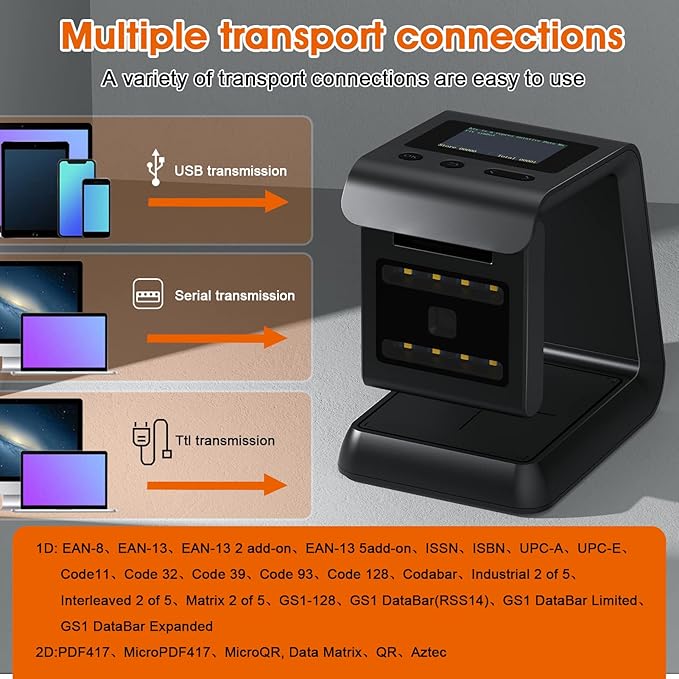 Alacrity 2D QR Wireless Barcode Scanner Hands-Free Omnidirectional Desktop Bar Code Scanner with Screen Display Compatible with Bluetooth & 2.4GHz Wireless for Airport Supermarket
