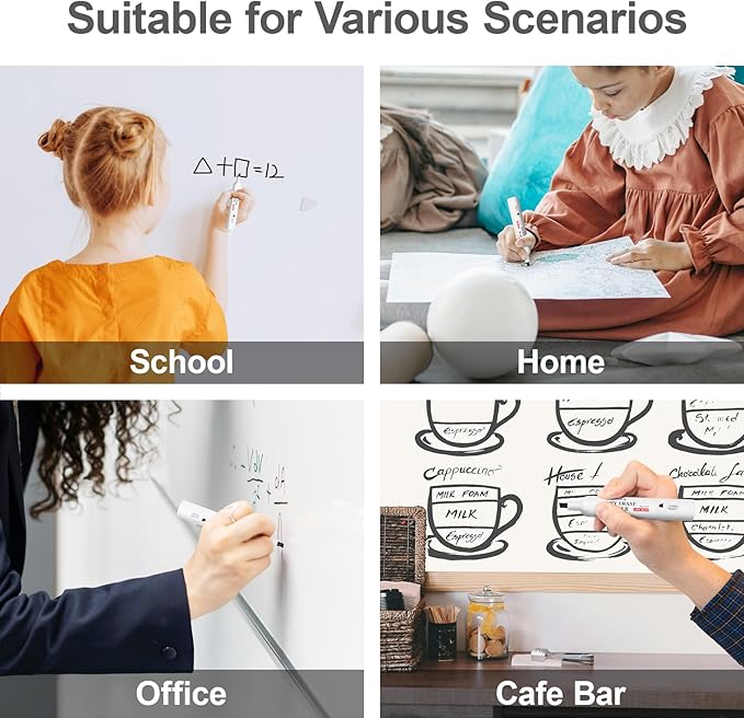 • Quick-Drying and Easy to Erase: The whiteboard markers is perfect for recise writing on non-porous surfaces such as whiteboards, glass, porcelain etc. With water-based ink, it is easy to wipe off without leaving stains and ghosting on whiteboard