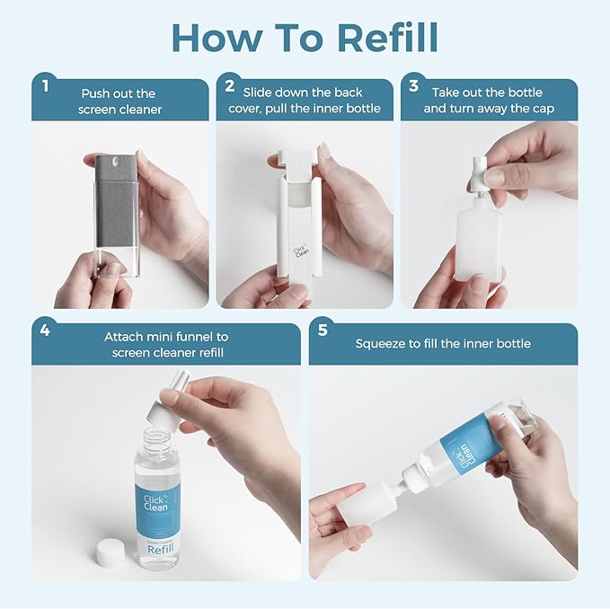• ALL-IN-ONE MULTIFUNCTIONAL CLEANER KIT- In addition to the 4 screen cleaners included, you get one 4oz bottle of refill, 1 microfiber cloth, 1 mini funnel (built-in), and a sprayer. The refill extends the product's life; the mini funnel helps you refill the cleaner; the sprayer mounts to the refill spout, and the fibre cloth is a new product.