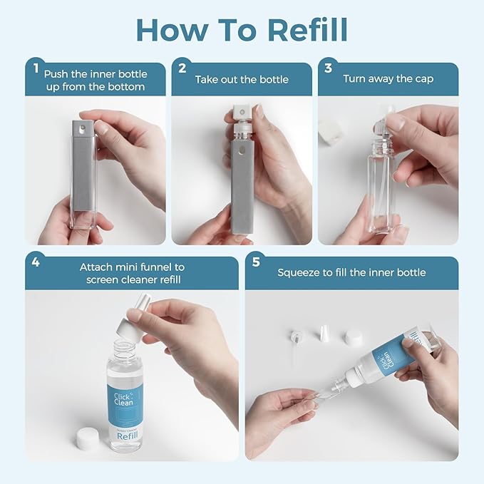 • ALL-IN-ONE MULTIFUNCTIONAL CLEANER KIT- In addition to the 2 screen cleaners included, you get one 4oz bottle of refill, 1 microfiber cloth, 1 mini funnel (built-in), and a sprayer. The refill extends the product's life; the mini funnel helps you refill the cleaner; the sprayer mounts to the refill spout, and the fibre cloth is a new product.
