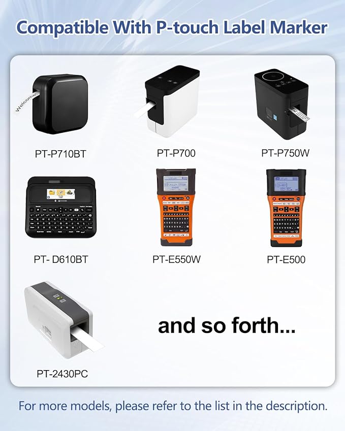 - Compatible for P-touch Label Printers: PT-1400, PT-1500, PT-1500PC, PT-1600, PT-1900, PT-1910, PT-1950, PT-1960, PT-2110, PT-2200, PT-2210, PT-2300, PT-2310, PT-2400, PT-2410, PT-2430PC, PT-2500PC, PT-2600, PT-2610, PT-2700, PT-2710,PT-2730, PT-2730VP, PT-330, PT-350, PT-3600, PT-520, PT-530, PT-540, PT-550, PT-580C, PT-7500, PT-9200DX,PT-9200PC, PT-9400, PT-9500PC, PT-9600 PT-9700PC, PT-9800PCN, PT-D600, PT-D600VP, PT-E500, PT-E550W, PT-H500LI, PT-P700, PT-P750W, PT-P750WVP, etc.