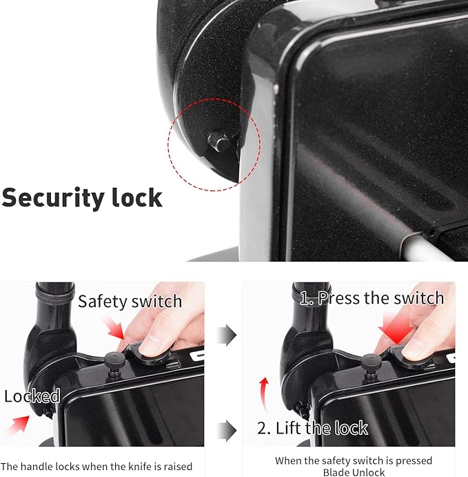 • Safety lock and protective cover give you double safety protection. Press the safety lock, the paper cutter can be used. The blue protective cover can not only prevent foreign objects from entering, but also prevent fingers from entering the blade