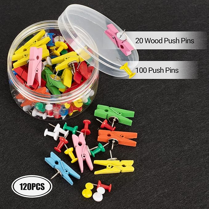 • Corkboard Set: 20 natural wood clips, beautiful and practical, hold more than 30 sheets of office A4 paper; 100 color pins, sturdy and durable, pin important papers and messages to cork boards; 1 plastic box, orderly placement of small parts