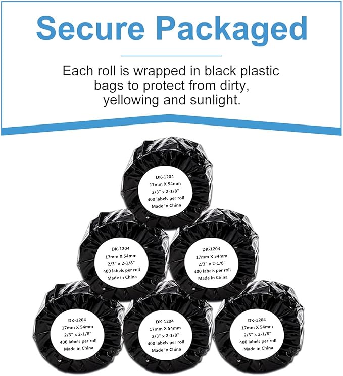 • All the characteristics you are looking for: 0.66 x 2.1 inch (17mm x 54mm) multi-purpose labels replace for brother DK-1204 will crystal clear print, strong adhesive make sure it doesn’t peel off easily. Resistant scratches and smudges. Every roll label in black poly bag for protection and storage