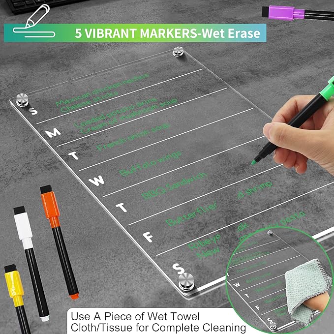 - [Easy to Write, Easy to Read, Easy to Erase] The magnetic menu for refrigerator is easy to clean and erase, you just use our cloth with water for complete cleaning. Your weekly meal planner magnetic without leaving any stains or ghosting. Acrylic meal planning is also reusable, which is better for our environment.