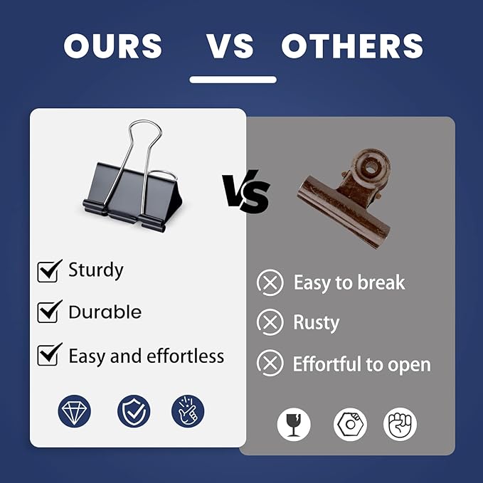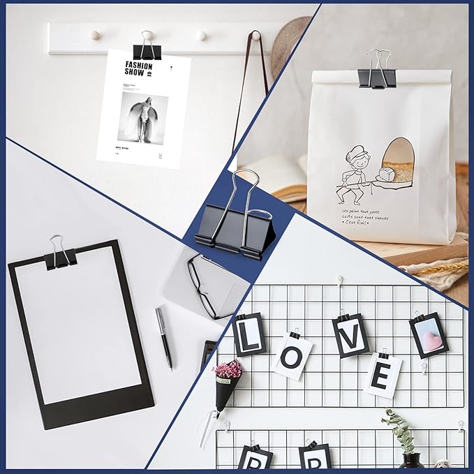 • MULTI-FUNCTION: Binder clips can be a useful and versatile tool in offices and kitchens. They can help you keep your papers organized and as chip clips to seal food bags, They are good office supplies and storage tools.