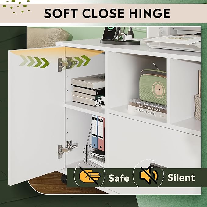 - All-purpose storage: The wide filing cabinet with shelf spaces and large storage drawer fulfill different organization needs. The shelves in the side cabinet helps to organize mess in home office, and the spacious top board can store office equipment such as printer and scanner.