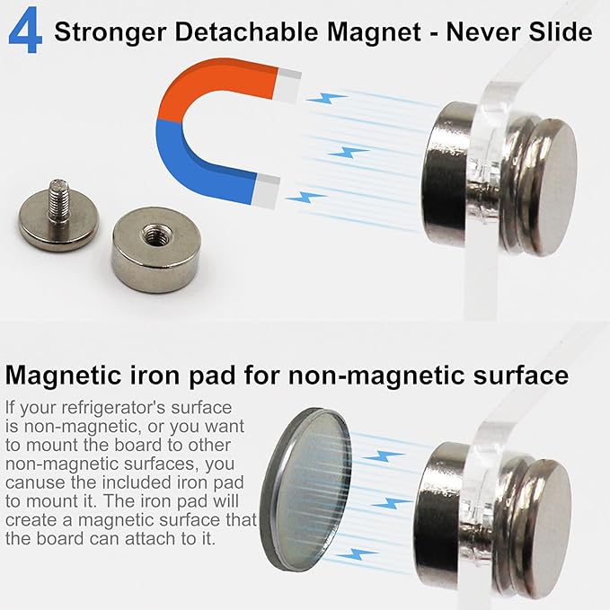 - [Anti-sliding & Anti-scratch & Sturdy Design] Dry erase board magnetic uses 4 extra strong magnets, which can be firmly attached to the refrigerator or various metal surfaces, with very strong grip. The magnet structure of the fridge dry erase board has been upgraded and is suitable for slightly curved refrigerator door. Clear dry erase board won't fall off or move easily unless manually. After removing the magnets, you can hang it anywhere.
