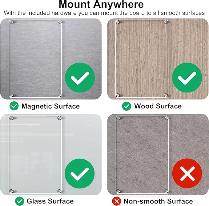 - [Easy to Write, Easy to Read, Easy to Erase] Our 12"x8" magnetic board for fridge is made of 0.12 inches clear thick acrylic, not easy to scratch and break. The acrylic white board surface is easy to clean and erase, you just use cloth with water for complete cleaning. Your acrylic dry erase board without leaving any stains or ghosting.