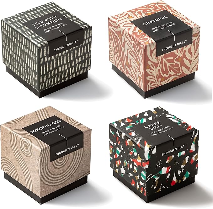 • THEME – LIVE WITH PURPOSE: Included in this pack are 4 boxes of ThoughtFulls - 1 box of Grateful, 1 box of Live with Intention, 1 box of Mindfulness, and 1 box of Carpe Diem. Every box features 30 cards, each with a unique quote to ground you. Share with a friend, family member, coworker, or anyone to encourage presence.