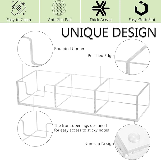 • Premium Acrylic Material: Stick note holder is made of premium crystal clear acrylic with high purity and clarity, which is stable, long-lasting and environmentally friendly. PLEASE DO NOT USE ANY ALCOHOLIC CLEANER TO WASH, to prevent damage to products. Use soft cloth to wipe instead